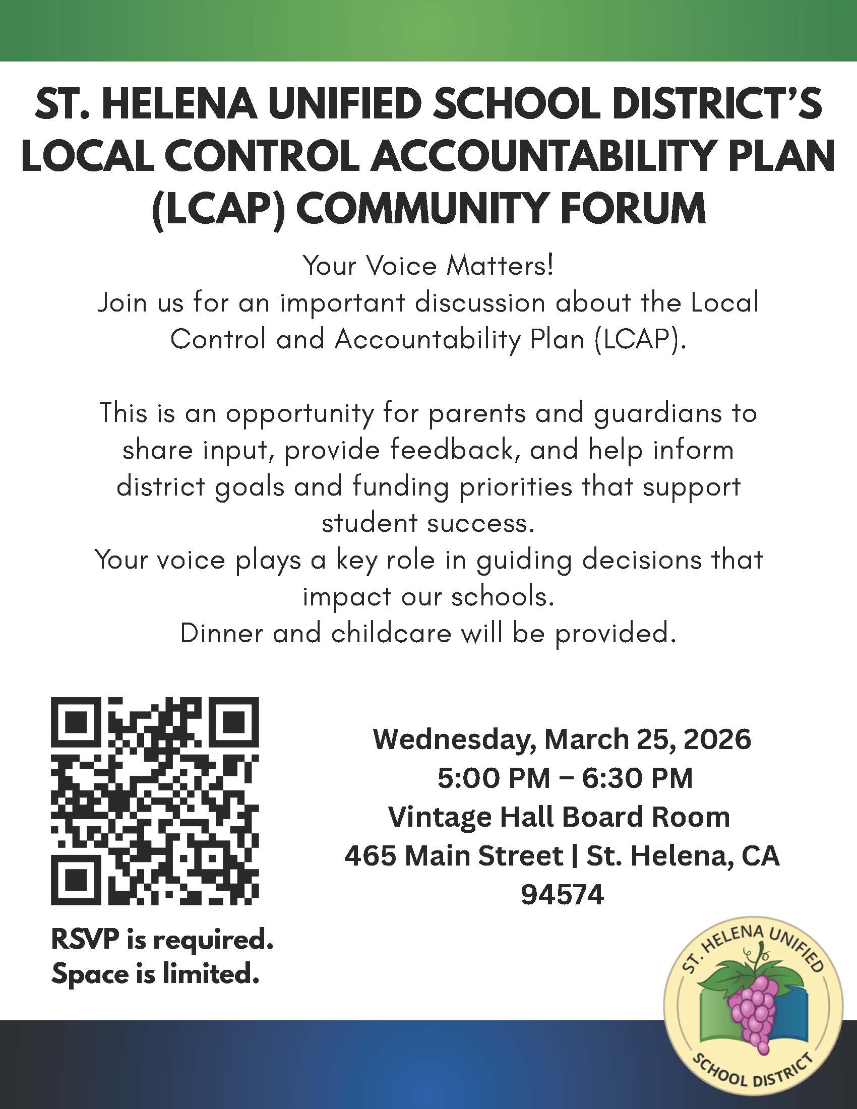 SHPS is a Transitional Kindergarten through Second Grade school located in the town of St. Helena, in the heart of the Napa Valley. It was newly opened in 2000. The facility is architecturally distinctive and beautifully landscaped. Garden beds, an outdoor gazebo and picnic tables by each classroom extend learning outdoors. There are fifteen classrooms; three portables housing Music, Spanish, and Physical Education; a multipurpose room/cafeteria, called "The Barn”; and an administration building housing the library/media center and staff offices. The views from the school are rural and beautiful in all directions.